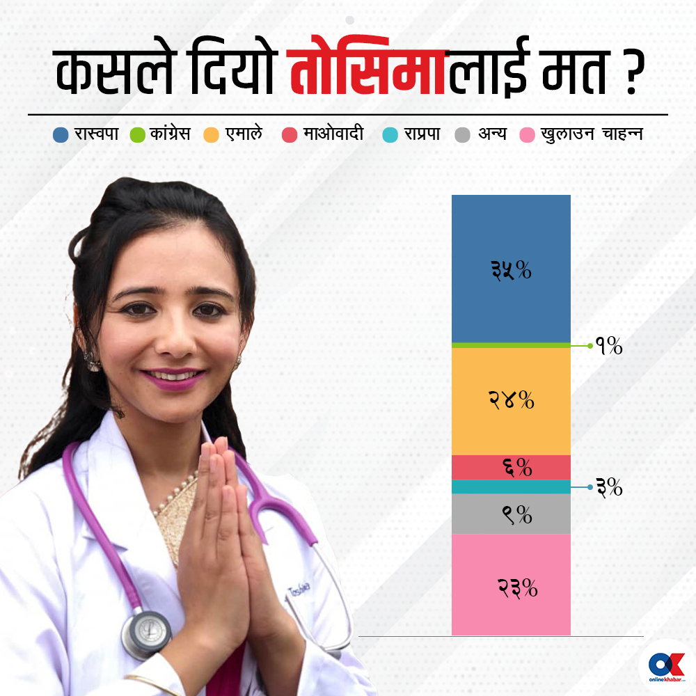तोसिमालाई भोट हालेको बताउने अधिकांश मतदाताले पुराना दल र यस अगाडिका सांसदप्रति आक्रोश पोखे । हरिसिद्धिमा भेटिएका ४३ वर्षे एक पुरुषले भने, ‘दुई पटक गरेर १० वर्ष सांसद भए खै के गरे त ? यसपालि त नयाँलाई मौका दिउँ भनेर घण्टीमा भोट हाले ।’